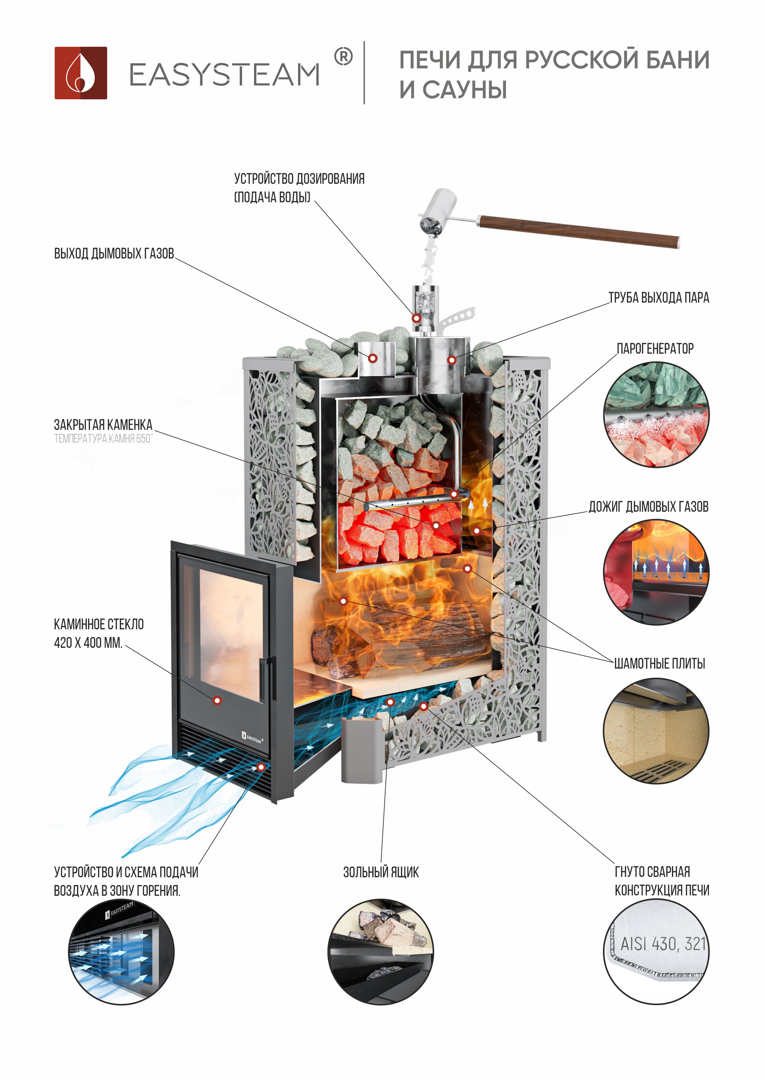 Закрытая каменка позволяет разогреть камни до высоких температур 500-600 градусов, а встроенный парогенератор обеспечивает попадание пароводяной смеси на нижний самый разогретый слой камней, и на выходе получить качественный мелкодисперсный лёгкий пар.