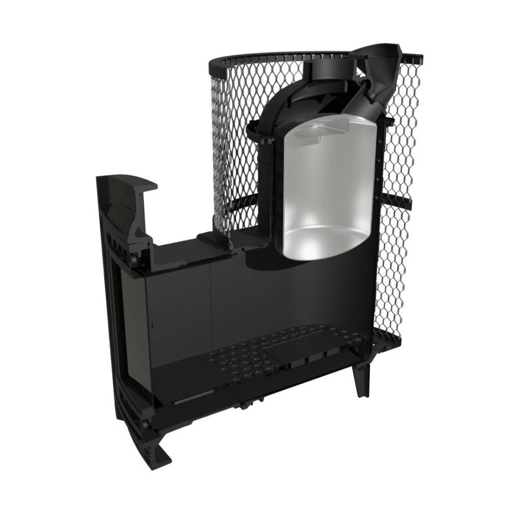 - Большая закрытая каменка из нержавеющей стали вмещает 25-30 килограмм камней. Благодаря тому, что каменка непосредственно соприкасается с камерой сгорания, камни, находящиеся в ней, максимально раскалены и при попадании на них воды генерируют мягкий мелкодисперсный пар.