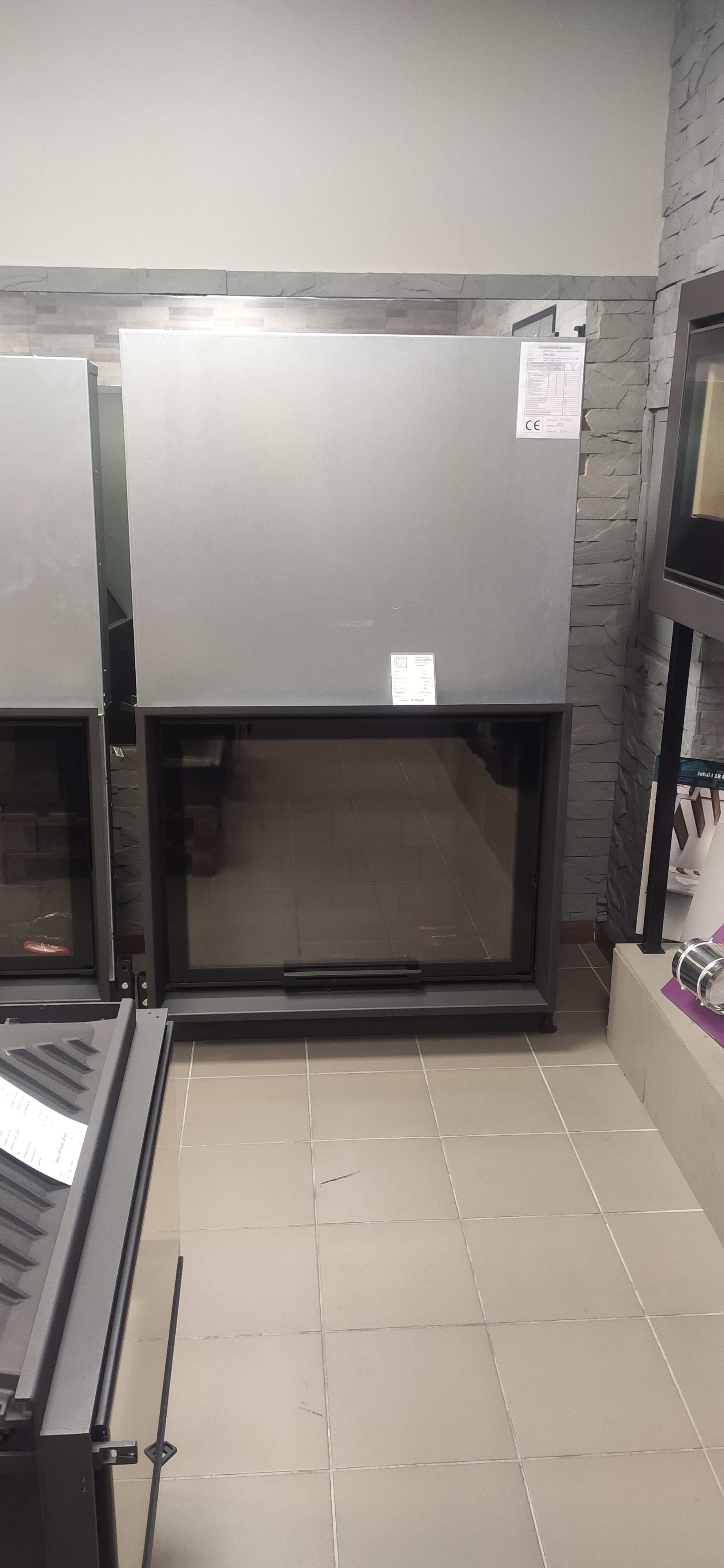 Топка шириной 1070 мм. Версия с увеличенной высотой дверцы до 750 мм. Двойным стеклом. Черным шамотом. Низким основанием 165 мм. Регулируемые ножки по высоте, колосник из чугуна, зольный ящик. Внутренняя часть рамы двери выполнена из нержавеющей стали.