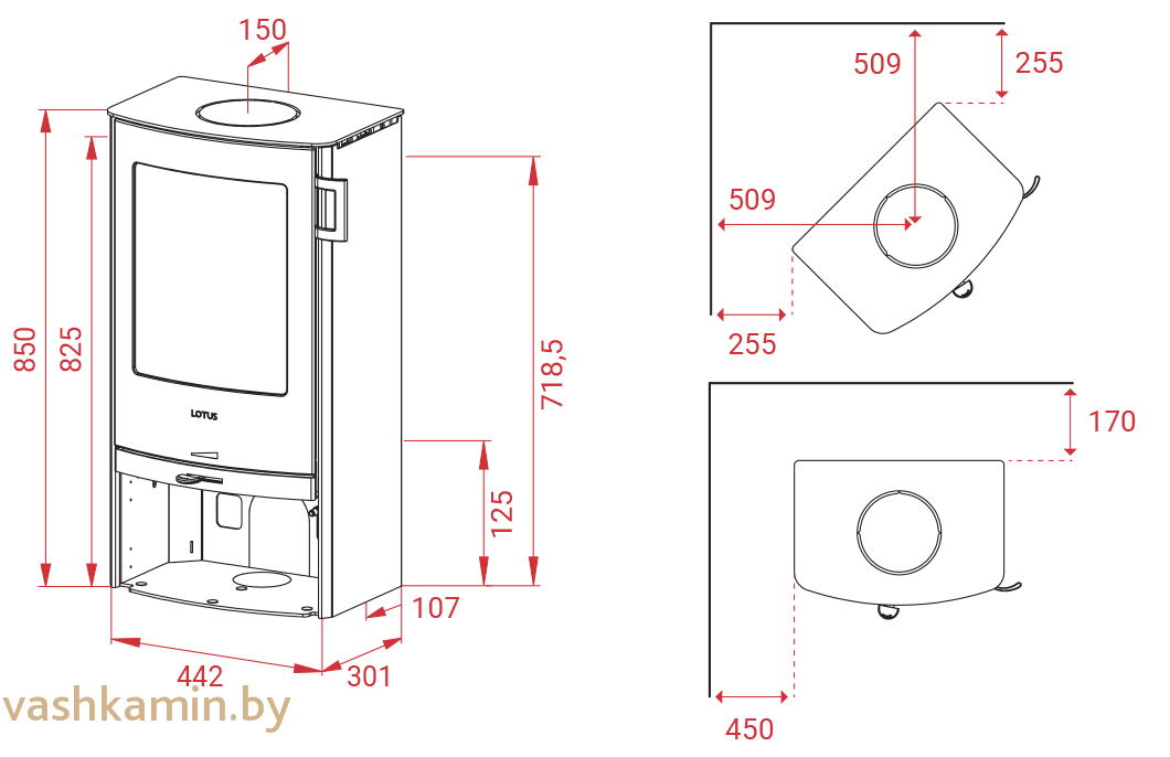 Lotus Jubilee Basic Печь-камин – базисная модель из серии Jubilee. Её отличают небольшие размеры всего изделия и внушительная топка, в которой могут поместиться дрова до 30 см длиной. Это достаточно производительная печка с возможностью обогрева помещения до 50 м2.