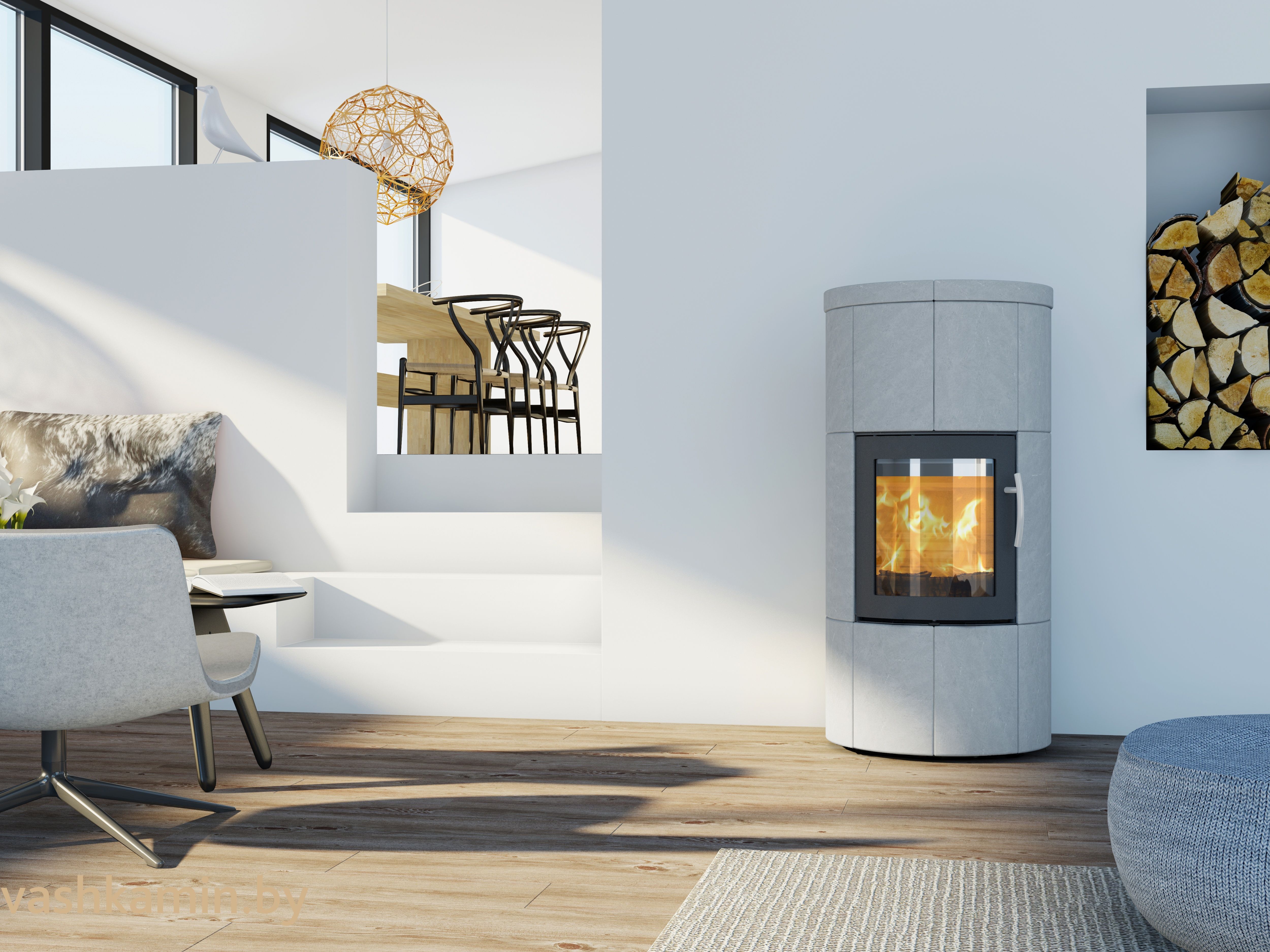 Функциональная модель, которая отлично справится с функцией обогрева помещения. Концепция производителя — простая, долговечная и безопасная эксплуатация. Лаконичная цилиндрическая форма позволяет рационально использовать пространство. Для управления пламенем предусмотрен удобный рычаг из нержавеющей стали. Возможен заказ камина с духовкой в качестве дополнительного приспособления. К преимуществам модели можно отнести экономное потребление древесины.
