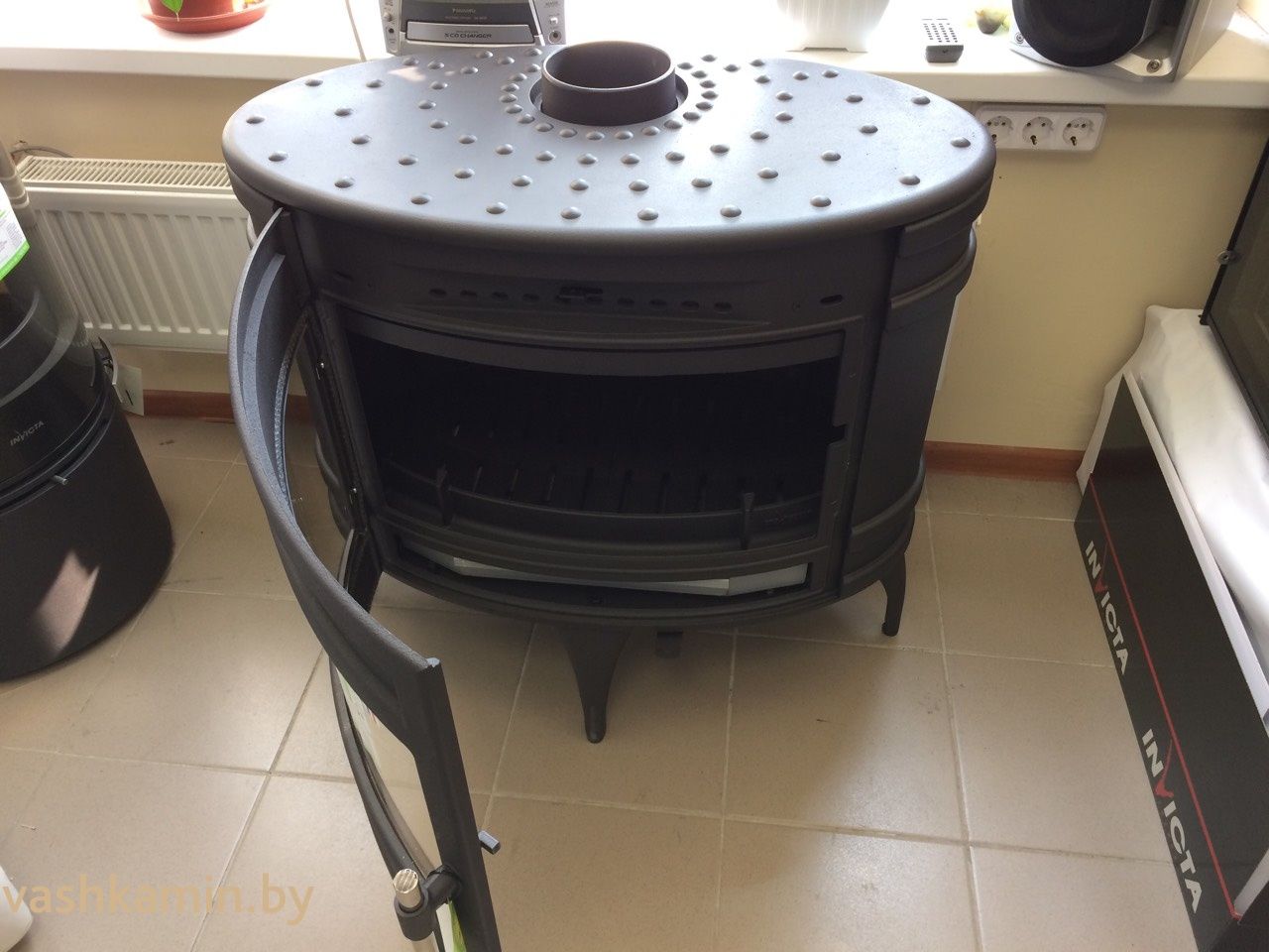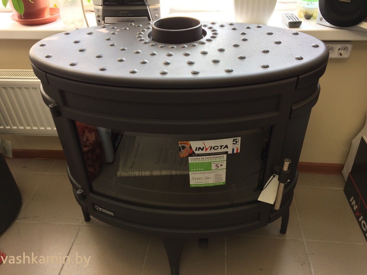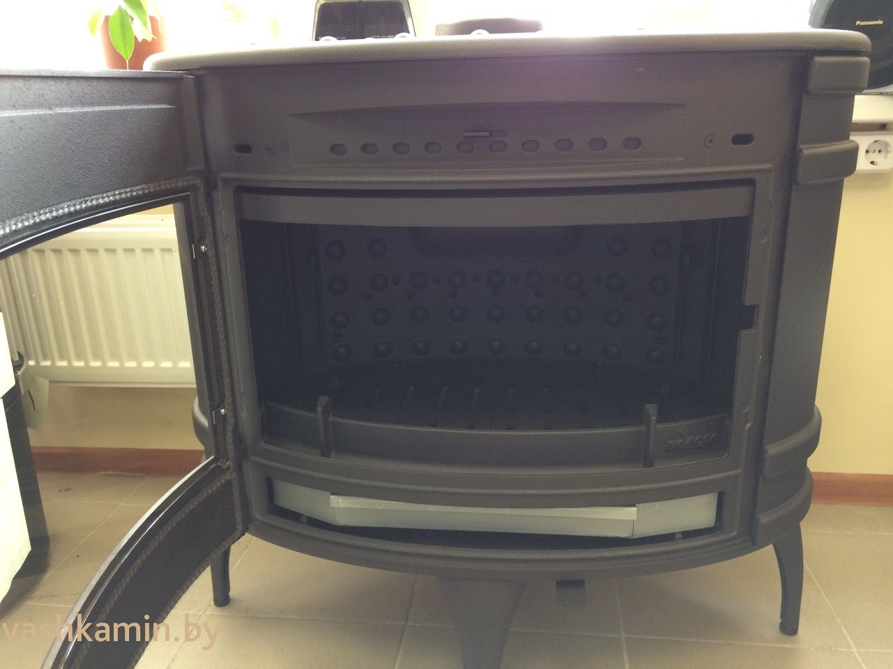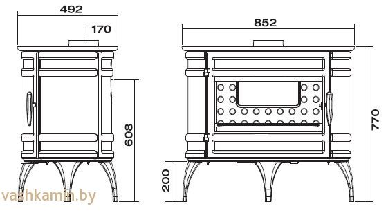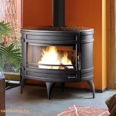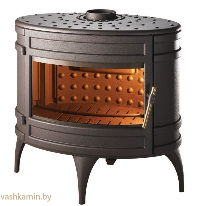 Полностью чугунная печь. Выполнена в стиле кантри овальной формы с большой панорамой стекла. Средняя мощность печи составляет 12 кВт в час отлично подойдет для отопления небольшого дачного и загородного дома. В печи две подачи воздуха. Первичный воздух для горения подается под дрова для розжига и горения. Вторая находится в верхней части дверцы. Через нее воздух обдувает стекло помогая ему оставаться чистым при большем количестве растопок. Подключения к дымоходу сверху или с задней стенки.