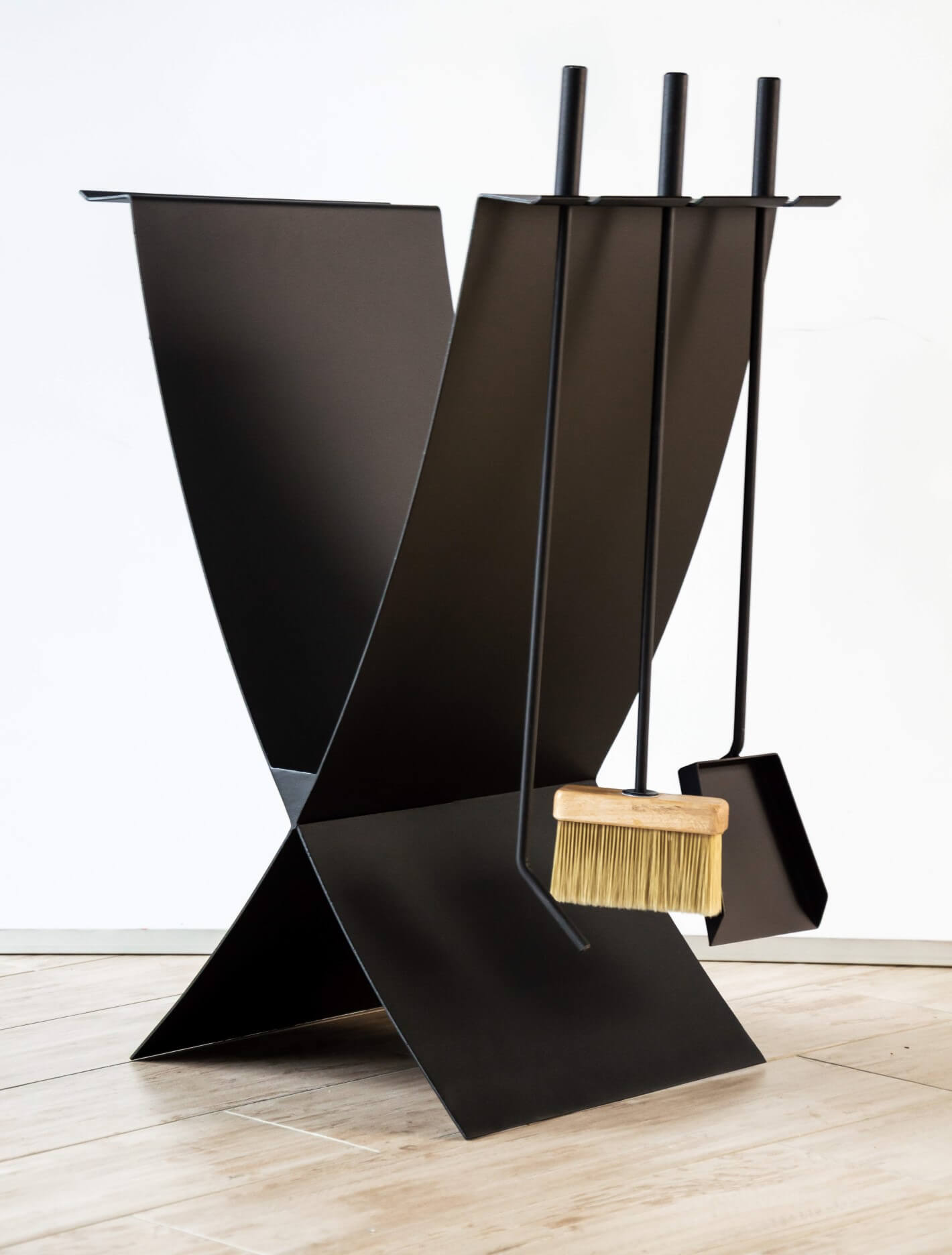 К дровнице прилагаются три аксессуара: совок, метёлка и кочерга. Они все хранятся прямо на корпусе дровницы, что делает её очень компактной и удобной.