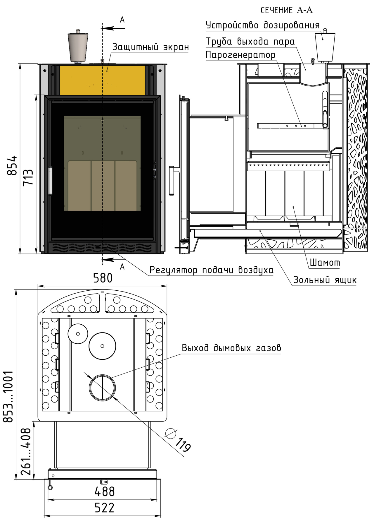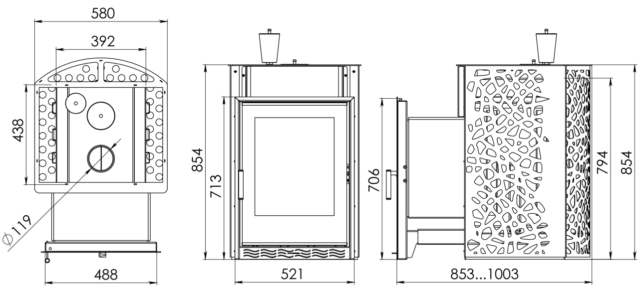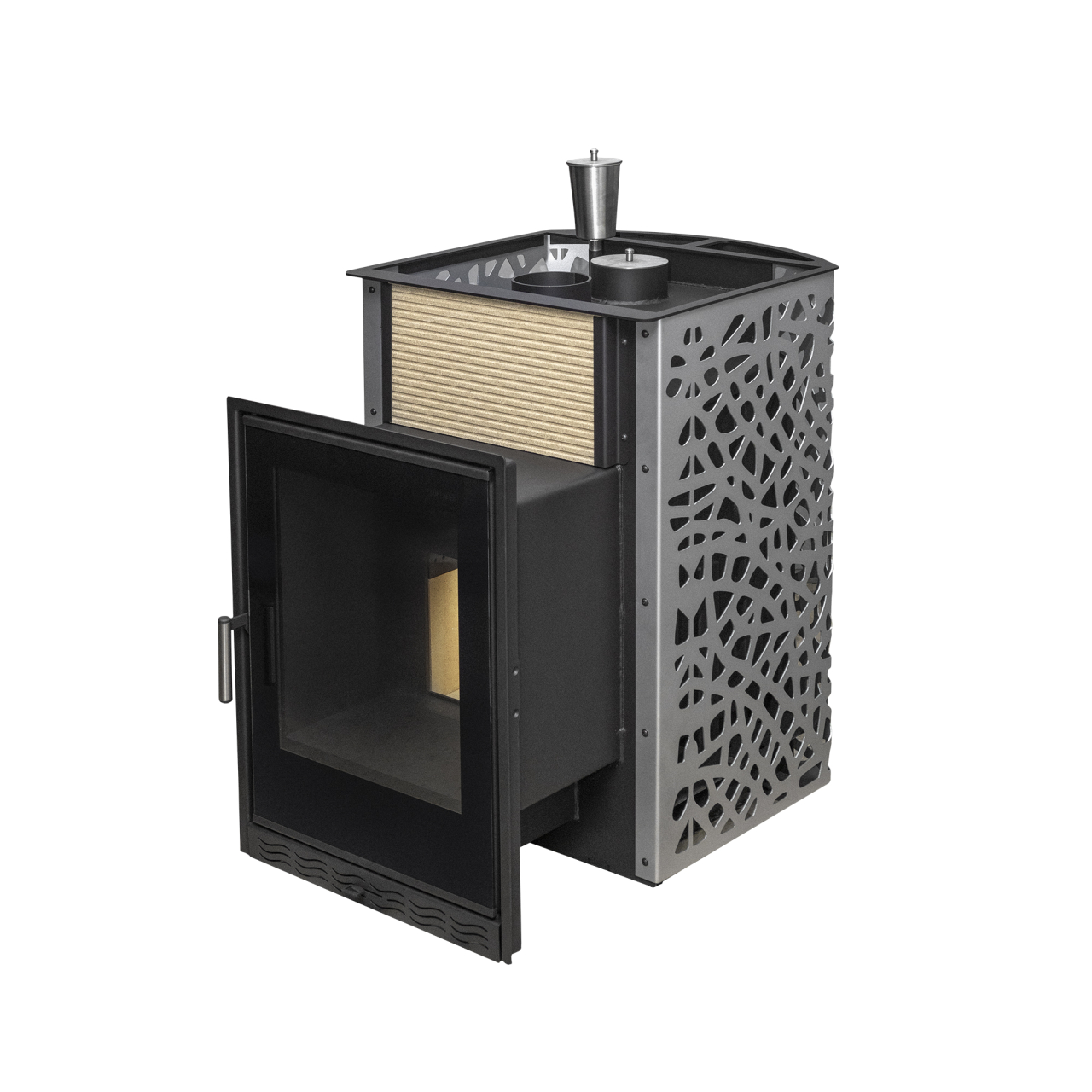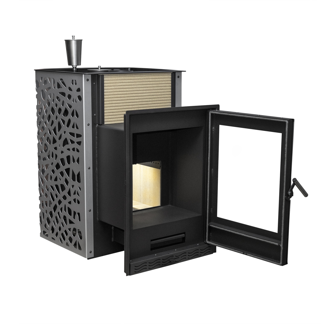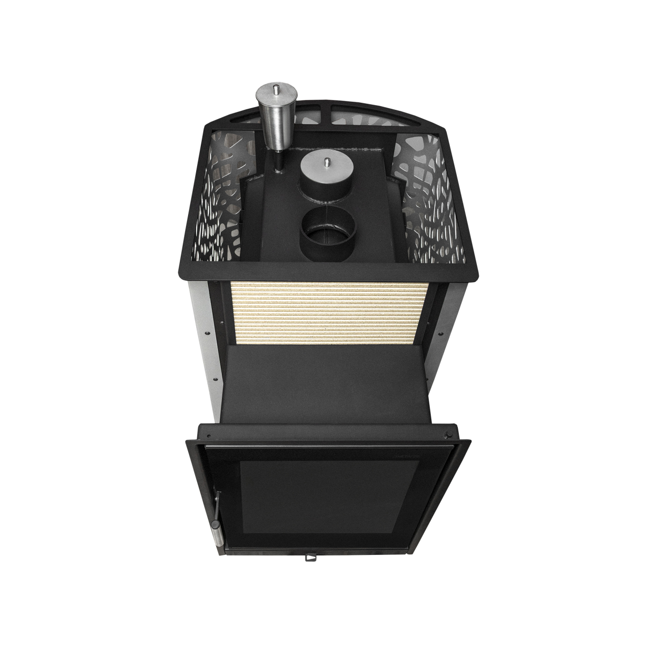 Мощность 20 кВт и увеличенная топка позволяют печи быстро прогревать парную объемом до 20 м³, создавая равномерный глубокий жар. Каменка открытого типа, выполненная из особого жаростойкого сплава, обеспечивает мягкий пар, который так ценится знатоками настоящей бани.