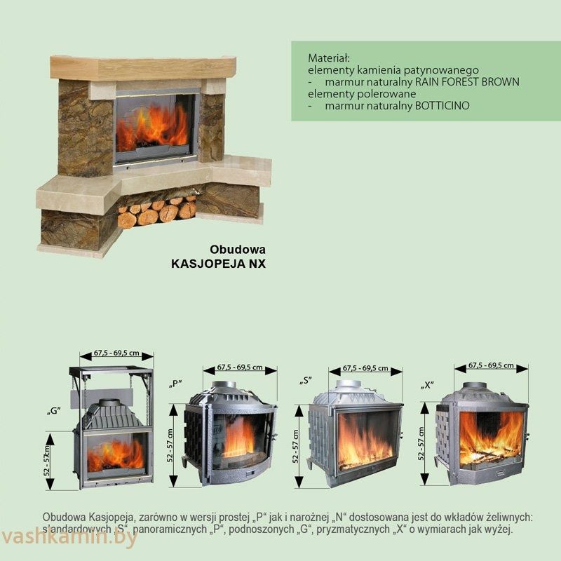 Облицовка как в прямой „P“, так и угловой „N“ версиях? применяется для чугунных топок: стандартных „S“, панорамных „P“, подъемных „G“, призматических „X“ размером как выше.