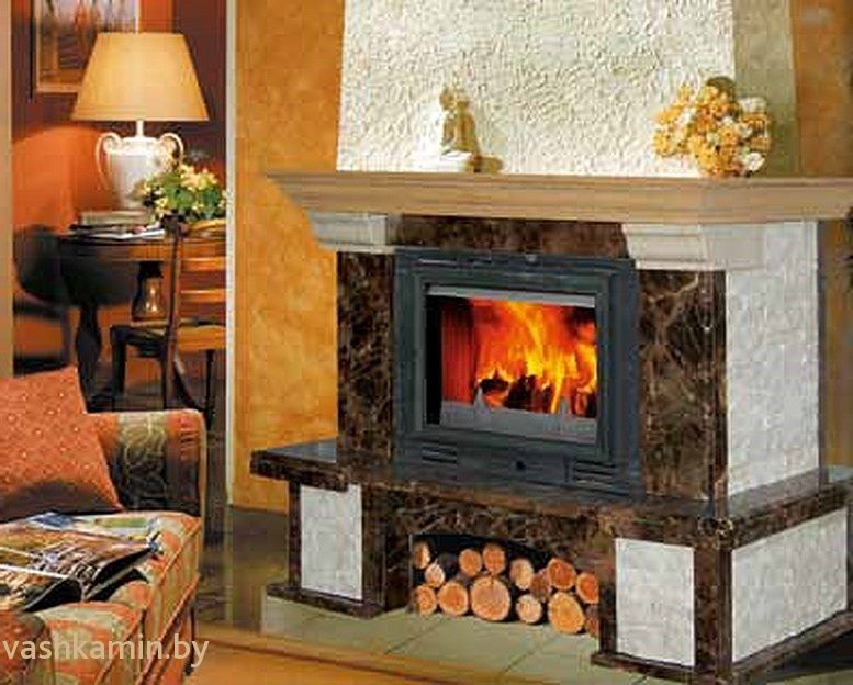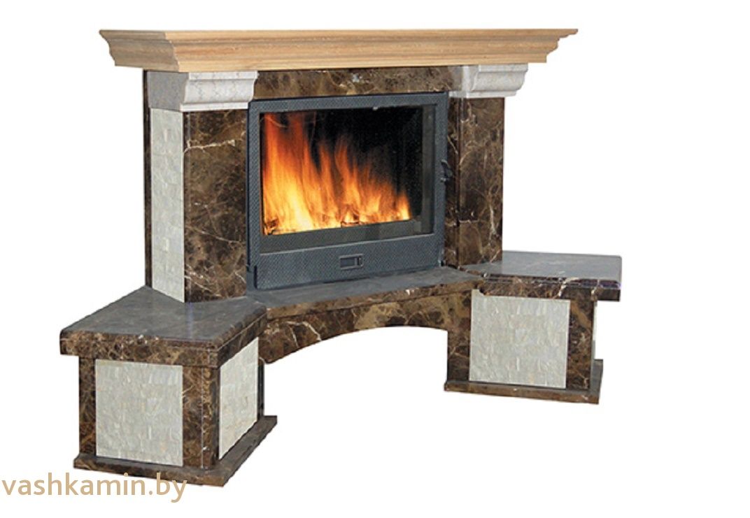 Модель выполнена из полированного мрамора с резной дубовой полкой. Сочетая в себе элементы дерева, подойдет для гостиной, выполненной как в классическом, так и современном стиле.