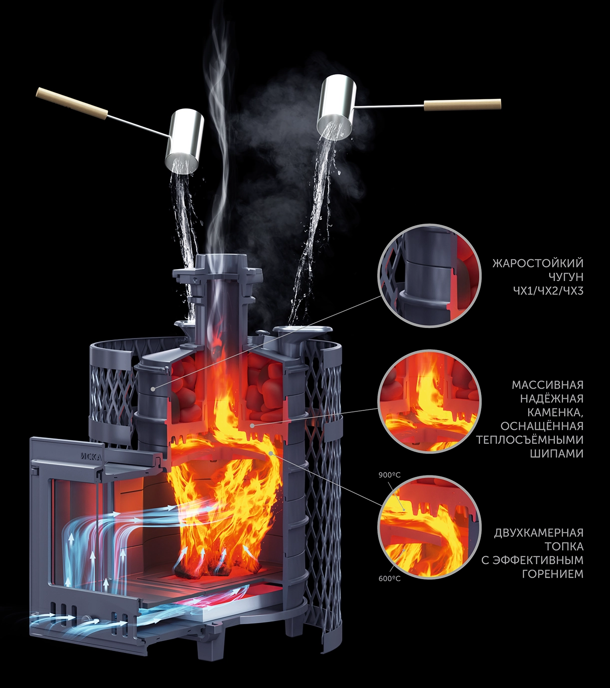 Печь Искандер получила от старших моделей парообразователь прямого нагрева - чугунную каменку имеющую существенную толщину и массу для аккумуляции тепла. Нагреваясь свыше 600С она эффективно нагревает дополнительный заряд, и при попадании воды даёт лёгкий мелкодисперсный пар. Расположенные снизу теплосъёмные шипы ускоряют нагрев парообразователя.