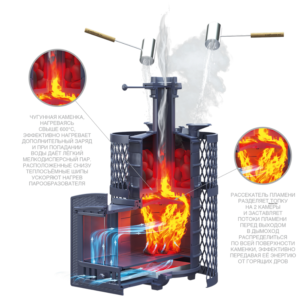 Рассекатель пламени разделяет топку на 2 камеры и заставляет потоки пламени перед выходом в дымоход распределиться по всей поверхности каменки эффективно передавая её энергию от горящих дров.