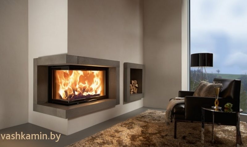 - удобно открывающейся дверцей. Она выполнена из цельного стекла, изогнутого под углом 90 градусов, открывается вверх, что облегчает закладку топлива. Расположенное слева или справа боковое стекло обеспечивает двусторонний обзор на огонь. А наличие дополнительного бокового открытия облегчает уход за топкой;