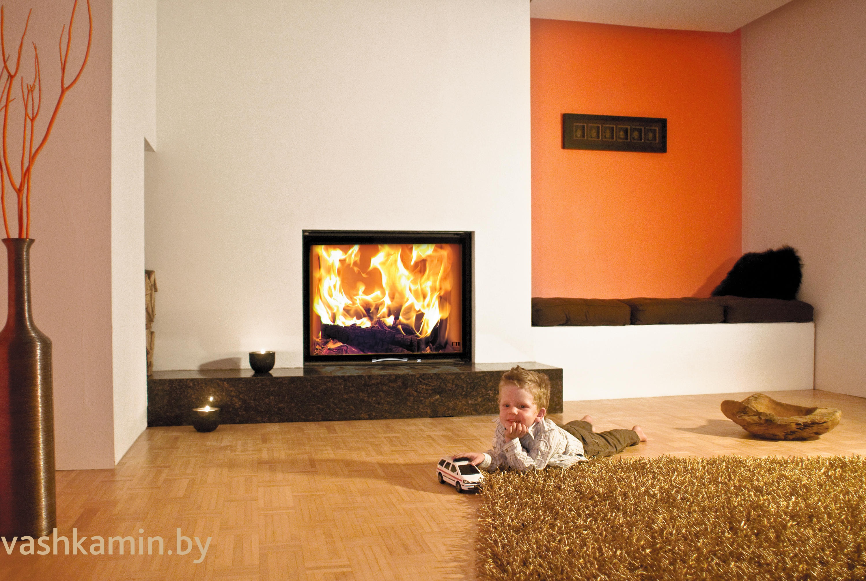 Современный, лаконичный минимализм, который одинаково хорошо подходит под интерьеры от Хай-тека до современных классических. Никаких грубых видимых элементов, все качественно сделано с немецкой педантичностью к мелочам, белоснежная футеровка на которой огонь горит естественно и ярко., Кстати про горит огонь.. Само собой разумеется, как и все лучшие современные каминные топки, все топки Austroflamm - подовые. Подовые топки отличаются красивым горением за счет совсем другой подачи воздуха, чем в обычных колосниковых за счет верхней подачи, как правило, предварительно подогретого уличного воздуха. Но не все они горят одинаково. Чем выше температура в топке и лучше организован комплекс технических решений, тем красивее горит огонь в топках, более чутко они управляются. Особенно сложно все это получается организовать в большеформатных топках. Но кому-то это удается лучше. Чистое стекло, чистая футеровка и необычно-красивое горение газов в этих печах и топках давно уже стали визитной карточкой этого премиального бренда.