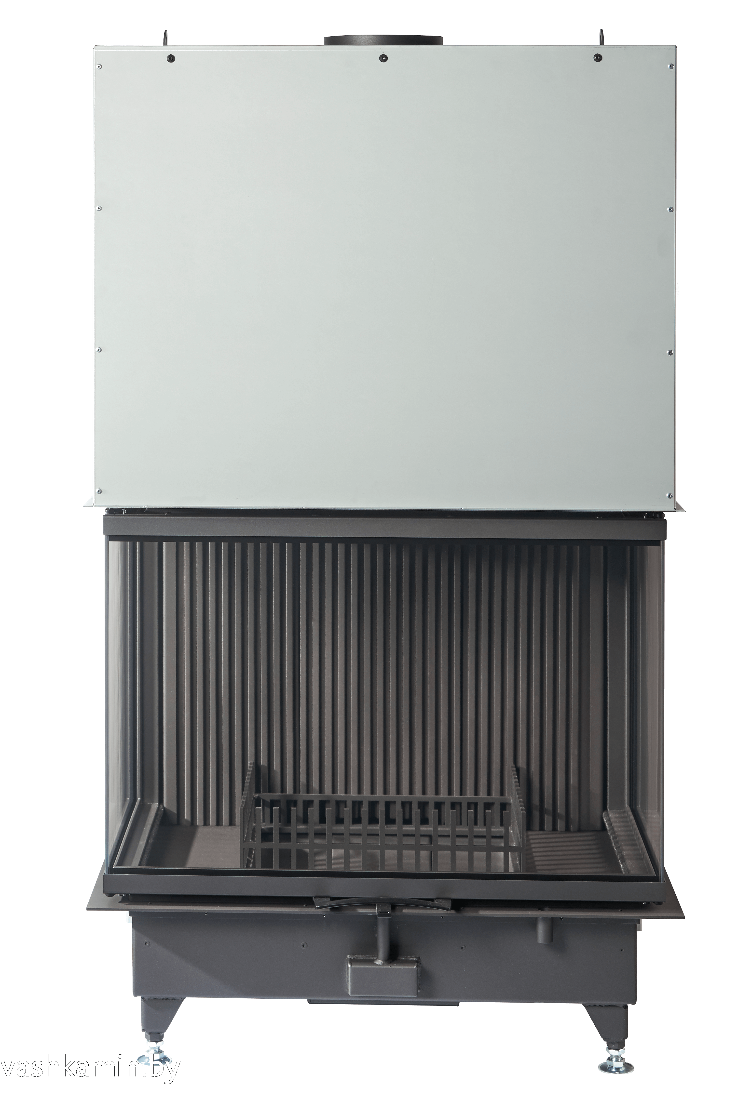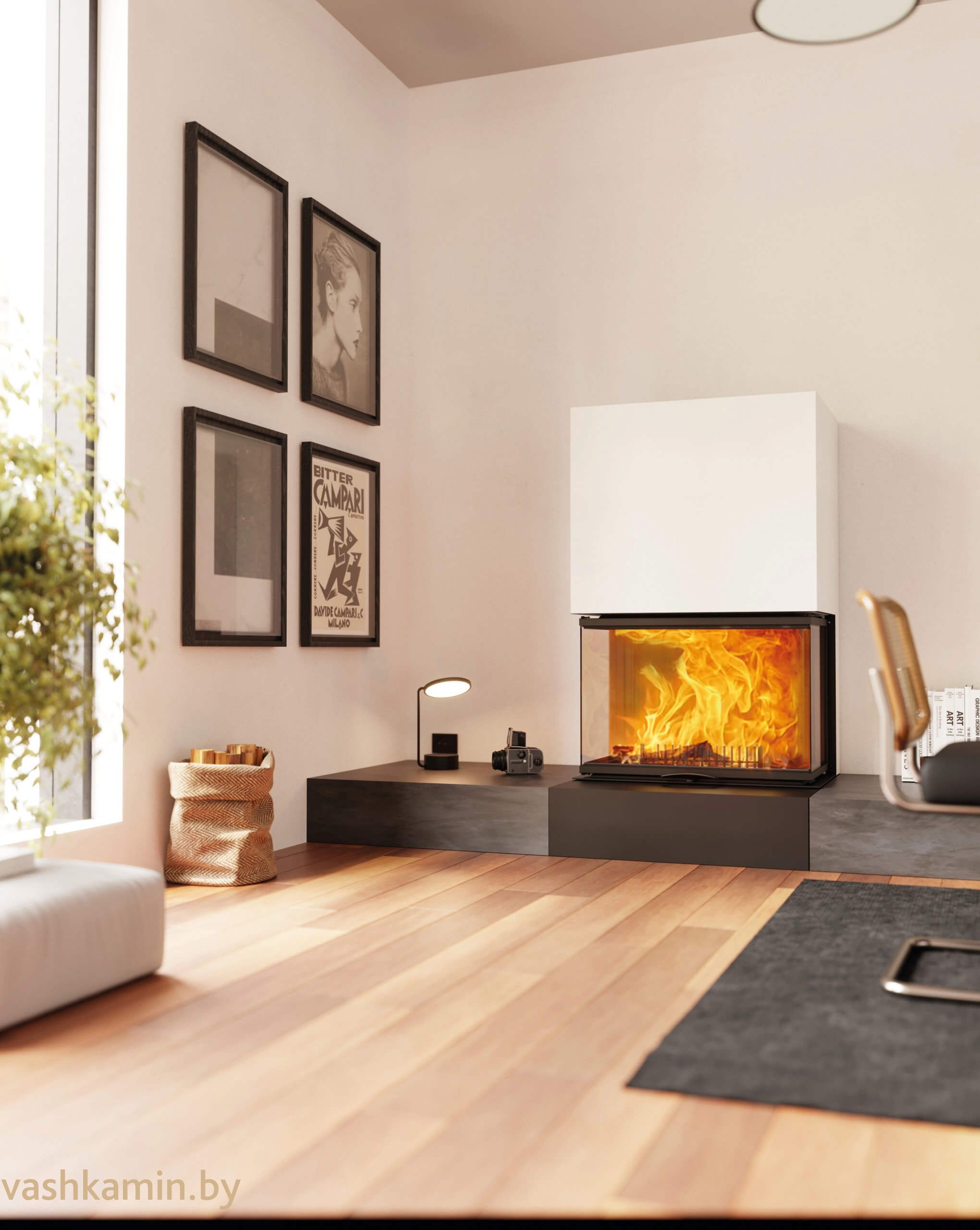 К главным отличительным особенностям дизайна этой серии от предыдущих можно отнести новую, отличающуюся от общей стилистики Austroflamm футеровку из металла в виде тонкой соломки черного цвета. В тон черной футеровки, топка этой серии комплектуется тонкими алюминиевыми ручками, также черного цвета. Впервые в трехсторонних топках Austroflamm появляются новые для рынка довольно высокие ограничители для дров. И это не дань моде, а совершенно обоснованная функциональная особенность. Во-первых, в закрытом режиме это позволяет сфокусировать укладку дров в центральной части топки, благодаря чему горения огня выглядит более эстетично и… благодаря этому наши стекла остаются дольше чистыми, так как нет непосредственного соприкосновения языков пламени со стеклом и воздушные потоки обеспечивающие постоянное омывание стекла (воздушная занавеса) выполняют свою функцию более корректно.. А ведь все мы знаем, что хуже всего в плане чистоты стекол дела обстоят именно в трехсторонних топках, ввиду сложностей выполнения в таких топках некоторых физических требований. А так как эта новая серия специально «заточена» под возможность использования камина в двух режимах (открытом или закрытом), то такой формы ограничитель дров в открытом очаге служит удобным и безопасном контейнером для дров определяя им нужное «свое» место. Такое решение позволило сделать под топки ровным, что особенно эстетично смотрится с поднятым стеклом. Но и это еще не все отличительные технические «фишки» новой серии. Для любителей посидеть у открытого огня, для новой серии топок технологи Austroflamm специально разработали новый подъемный механизм. Инновация здесь не только в том, что его работа стала еще легче, мягче и тише, главная особенность, что теперь, с новым механизмом, стекло поднимается максимально высоко практически прячась под зашивку камина, чтобы ничего не отвлекало наш взгляд от наслаждения игрой огня. И это еще не все отличия. Обратите внимание, что глубина задней стенки новой серии минимальна.. Ничего не должно мешать нашему наслаждению красотой огня — максимальный обзор со всех сторон! Vuur Drie — три огня (голландский)