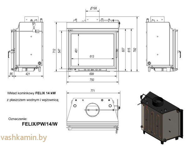 Встраиваемая топка FELIX PW/14/W с большой камерой сгорания от польской компании KRATKI. Топка средней производительности с широким плоским стеклом (его размер составляет 613х461) и встроенным теплообменником. Топки KRATKI имеют множество стандартных «функций», а кроме этого большой выбор дополнительных опций.