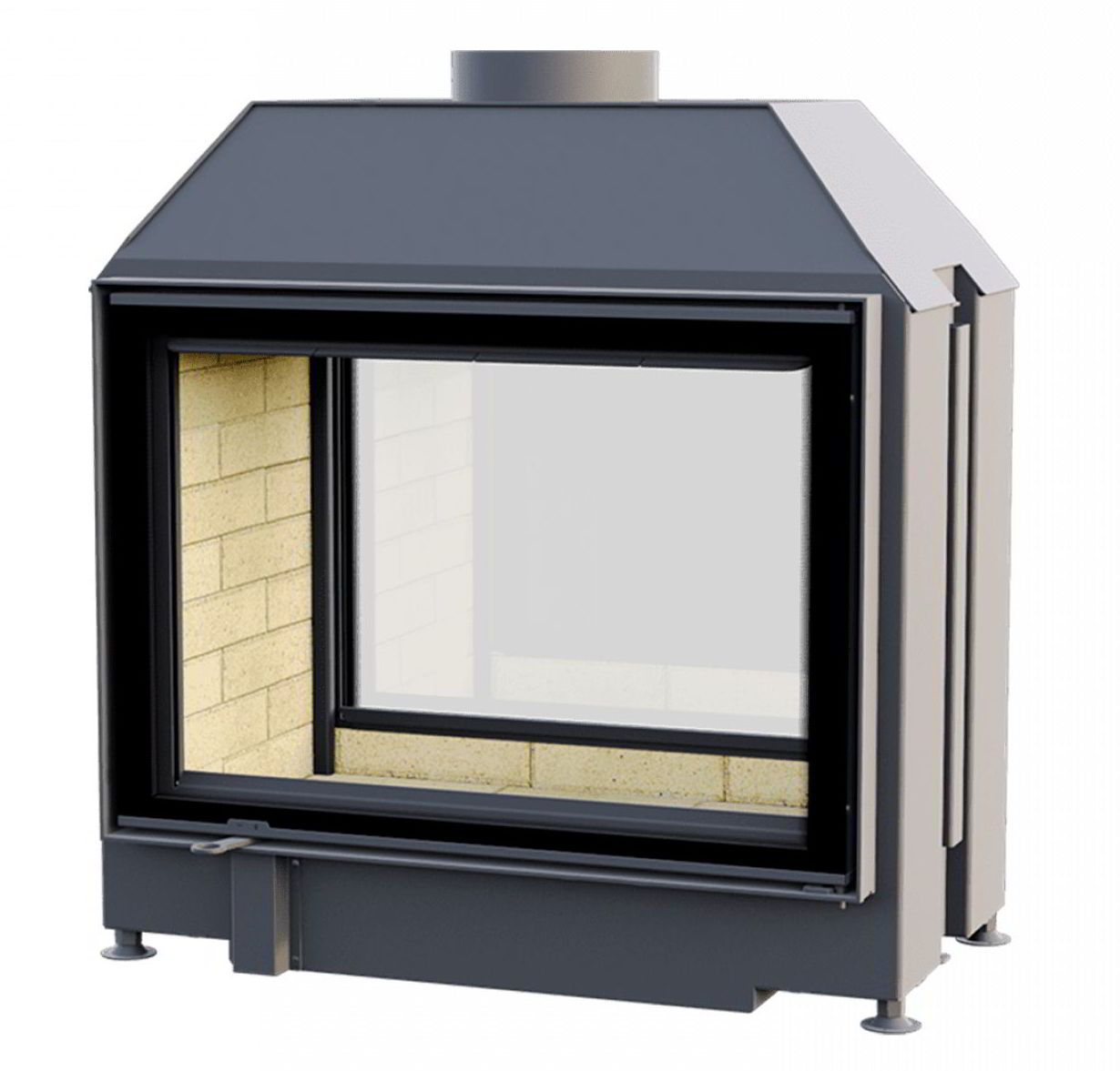 Две дверцы с прямым стеклом. Пространная, сквозная модель, великолепно вписывается в межкомнатные перегородки, для созерцания огня как из гостиной, так и из спальни или кабинета, служит отличной основой, для создания центрального (островного) камина.