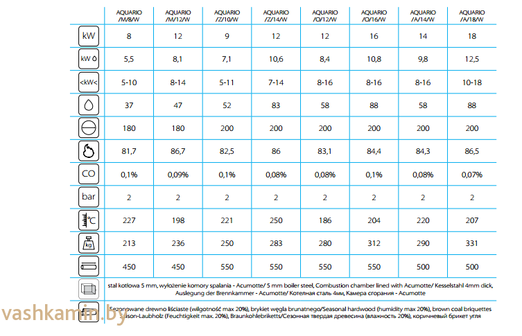 b. ПАРАМЕТРЫ Сгорание Вставка AQUARIO – это так называемая безрешетчатая вставка. Сжигание дров осуществляется на плите, так наз. дожигание пепла. Облицовка камеры сгорания керамическим материалом «Acumotte» увеличивает температуру в камере топки, что способствует улучшению параметров сгорания. Этот материал увеличивает температуру в камере сгорания, благодаря чему уменьшается выделение газов в атмосферу.