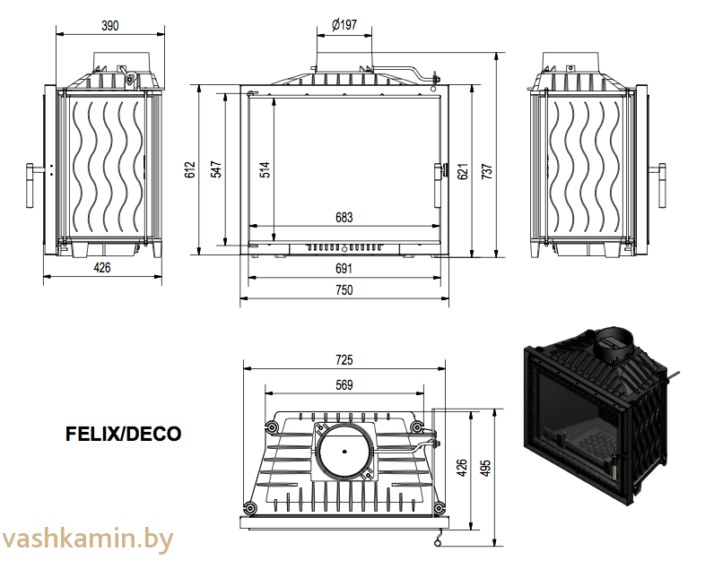 Встраиваемая топка Felix DECO с большой камерой сгорания от польской компании KRATKI. Современная интерпретация традиционного дровяного камина — встраиваемая топка со стеклом. Такие топки имеют хороший КПД (намного больше, чем открытый дровяной камин), а также отличаются более высокий уровнем безопасности — процесс горения происходит в закрытом объеме. Отличительными особенностями топок серии Felix DECO являются стальная рамка дверцы, стекло нового типа и современная стильная ручка. Доступны для заказа и другие модификации топки FELIX. Цену на модификации уточняйте у менеджера.