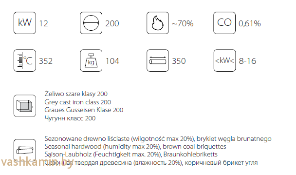 Топка из чугуна для дровяного камина Eryk, встраиваемого типа, производитель KRATKI. Для производства топочных камер серии Eryk производитель использует чугун высокого качества (класс 200), прочное стекло марки «Робакс» выдерживает высокую температуру. Камин со встроенной топкой — это не только декоративный элемент помещения, но и полноценный отопительный агрегат: топочная камера Eryk мощность 12 кВт может обогревать помещение объемом 300 куб.м.