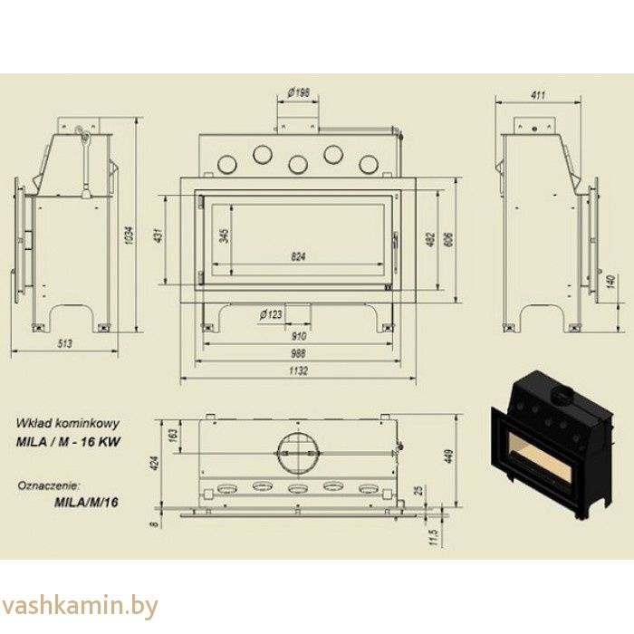 Mila от Kratki — встраиваемая топочная камера, выполненная из котельной стали. Представленная модель топочной камеры — широкоформатная топка (топка с большой стеклянной дверцей расположенной горизонтально) выполнена из стали и имеет футеровку. Топка Mila может обогреть помещение более 120 кв.м. жилой площади, работая на недорогом топливе (дровах или угле).